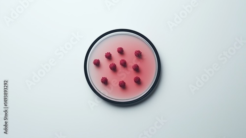 © Olha Koval, Fototapeta premium Petri dish with a red virus on a white surface. Top view.