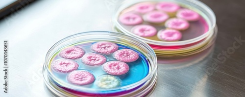 © PoyTumStudio, Naklejka premium Petri dishes with vibrant pink agar cultures, microbial growth in a lab