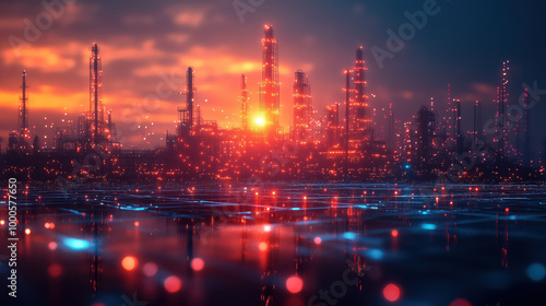 © Nathasa, Naklejka premium Petrochemical industry fuel factory zone with sunset sky background.