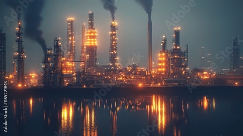 © WS Studio 1985, Fototapeta premium Petrochemical Plant at Night with Smoke and Reflected Lights