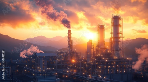 Naklejka premium Petrochemical plant at sunrise with steam rising from cooling towers and...
