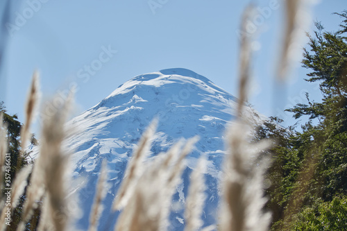 © Alex, Obraz premium PETROHUE, CHILE - FEBRUARY 11, 2020: The waterfalls, rapids and tourists of Petrohue on a sunny day in the lake region of Chile, near of Puerto Varas. Osorno volcano.