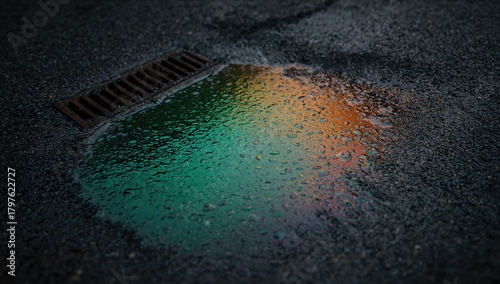 Obraz premium Petrol gasoline oil spill on road tarmac, environmental hazard, Earth Day