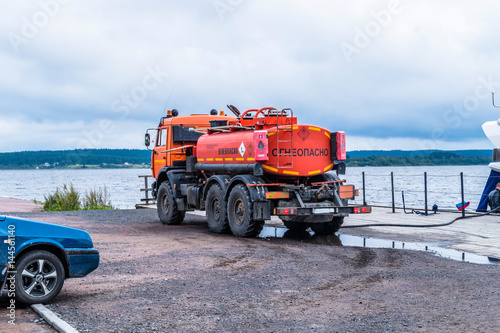 © viktoriya88, Obraz premium Petrol tanker stands on the river bank