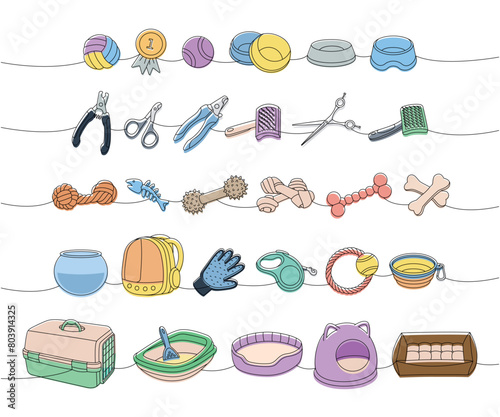 © Lifeking, Naklejka premium Pets accessories. Scissors, nail clippers, brush, fur remover, aquarium, backpack carrier, hair remover glove, tape measure leash, portable water bowl