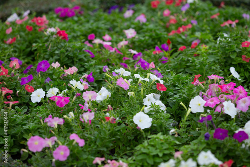 Naklejka premium Petunia is genus of 20 species of flowering plants of South American origin. The popular flower of the same name derived its epithet from the French. Nature background image of flower fields.