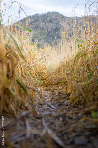 Fototapeta premium Pfad zwischen Grashalmen im Herbst, Froschperspektive