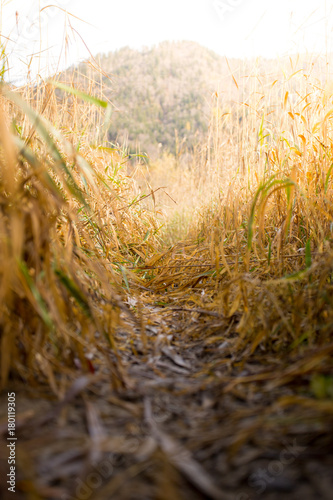 Fototapeta premium Pfad zwischen Grashalmen im Herbst, Froschperspektive