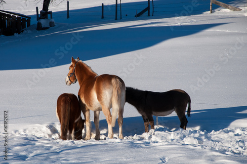 © consultdm15, Naklejka premium Pferd Ponny und Esel im Schnee