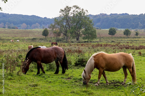 © Pears Glafey, Obraz premium Pferde im Feld beim Grasen