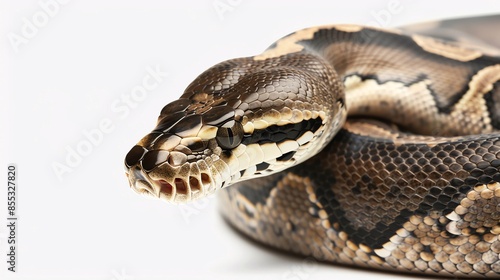 © Thanakrit, Obraz premium Phantom Ball Python A Phantom Ball Python with subtle, ghostly patterns, posed on a plain white background to honor World Snake Day