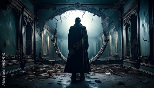 © Suchithra, Naklejka premium Phantom Reflection - Hooded Figure in a Ruined Mansion