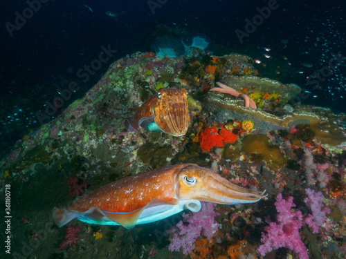 © Mayumi.K.Photography, Naklejka premium Pharaoh cuttlefish mating at the coral bommie