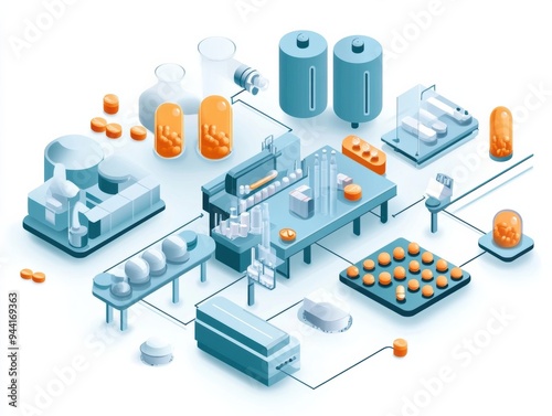 © Anutha, Fototapeta premium Pharmaceutical industry process with machinery and medication production elements