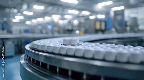 © Zahfran, Obraz premium Pharmaceutical manufacturing line producing construction hat