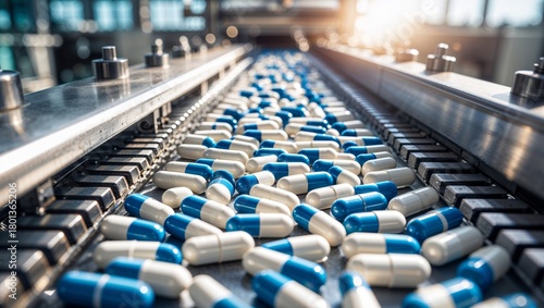 © demzp, Obraz premium Pharmaceutical production line with blue and white capsules in a factory setting