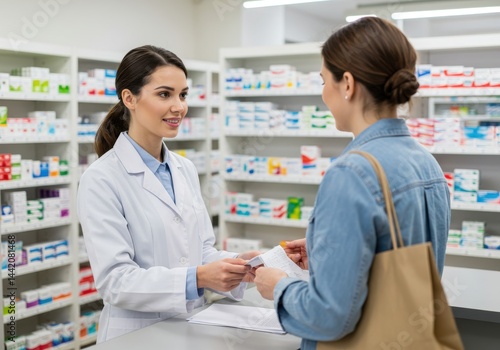 © Sejjil, Obraz premium Pharmacist serving customer isolated on white background