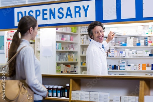 Obraz premium Pharmacist showing the medicine box to customer