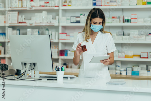 Obraz premium Pharmacist with protective mask on her face holding drugs and using digital...