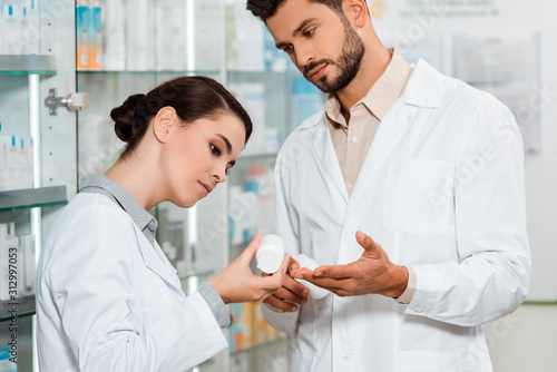Obraz premium Pharmacists in white coats looking at jar with pills in pharmacy