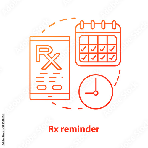 © IMG visuals icons, Naklejka premium Pharmacy concept icon. Rx medication intake reminder idea thin line illustration. Prescription drugs scheduled alarm. Smartphone medicine tracker. Vector isolated outline drawing