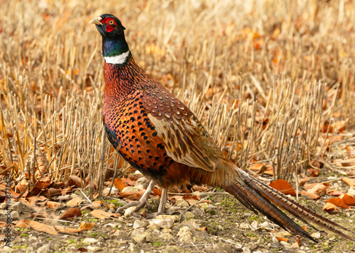 © Moorland Roamer, Fototapeta premium Pheasant cock bird. Colourful Ring-Necked male pheasant in Autumn, stood in cut corn field, with golden leaves and facing left. Scientific name: Phasianus colchicus. Horizontal. Space for copy
