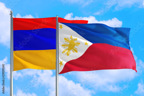 Fototapeta premium Philippines and Armenia national flag waving in the windy deep blue sky. Diplomacy and international relations concept.