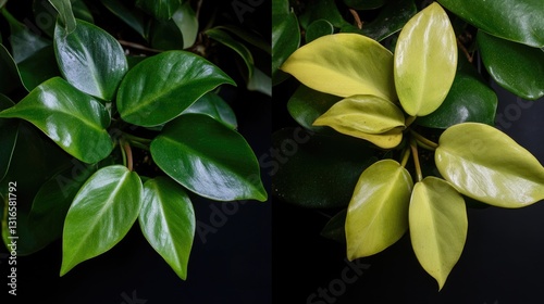 © Rapit, Obraz premium Philodendron leaf comparison displaying healthy versus nutrient deficiency