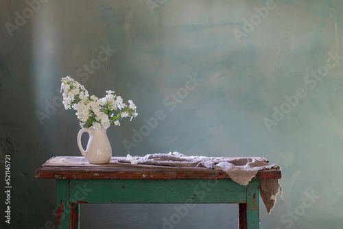 © Maya Kruchancova, Obraz premium phloxes in vase on old wooden table on green background