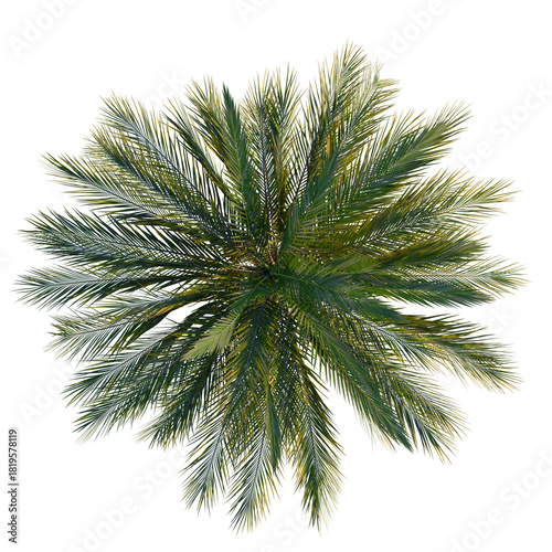 © DH Tree Stock, Naklejka premium Phoenix dactylifera tree plan, top view, cutout 4k, transparent background, Lush green palm tree from above evokes tropical paradise island vibes