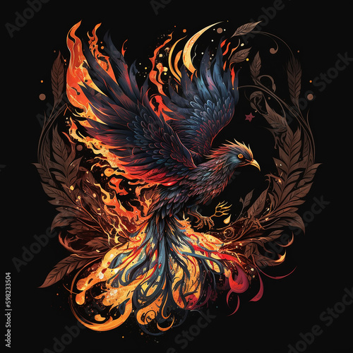 Obraz premium phoenix with blue wings emerging from fire , rebirth . Enlightenment and...