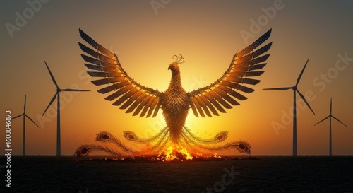 Obraz premium Phoenix with solar wings and wind turbines at sunset