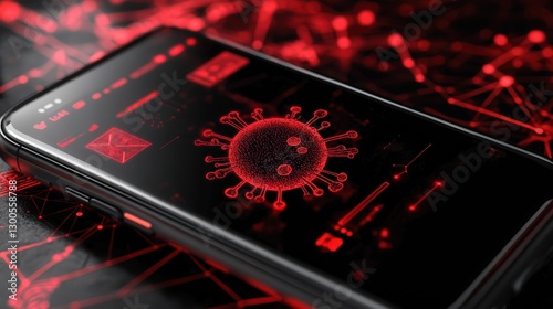 © Athirat, Obraz premium phone screen showing red alerts about SMS phishing, system hacking, and a virus spreading due to malware infection