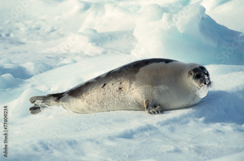 Obraz premium Phoque du Groenland, jeune, allaitement, Pagophilus groenlandicus, Ile de la Madeleine, Québec, Canada