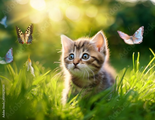 Obraz premium 緑の草むらで元気いっぱいに遊んでいる子猫。草の間から見つめのぞかせたり、蝶を眺めたりして遊んでいる姿は無邪気で愛らしく、草の緑と子猫の毛並みのコントラストが美しい