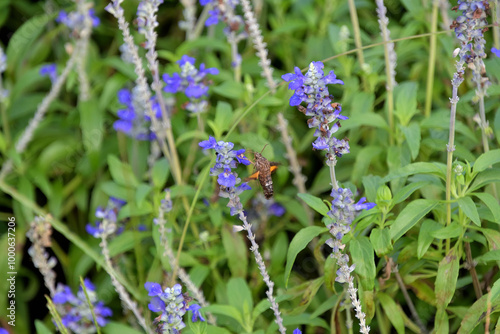 Obraz premium ホバリングしながらブルーサルビアの蜜を吸っているホシヒメホウジャク