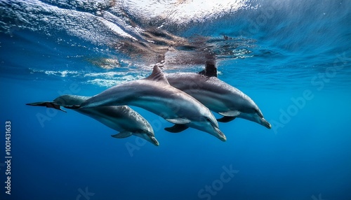 Obraz premium 海を背に、数頭の青いイルカが弧を描くように飛び跳ねている。太陽の光が水面に反射し、イルカの視線な体がキラキラと輝きながら、楽しそうに海を駆け抜けていく瞬間