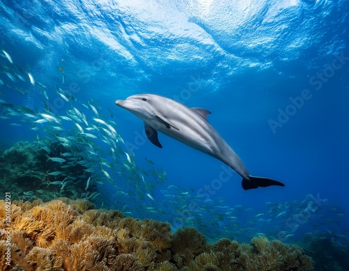 Obraz premium 深い青の静かな海の中で、一頭のイルカが悠々と泳いでいる。静寂の中でのんびりとした動きを見て、周囲には魚の集まりや海草がゆらゆらと揺れているだけの、平和