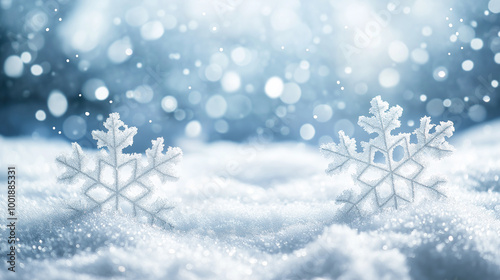 Naklejka premium 雪の結晶のマクロ写真が彩る冬の背景と氷・雪景色_12月・クリスマスシーン・寒中見舞い等