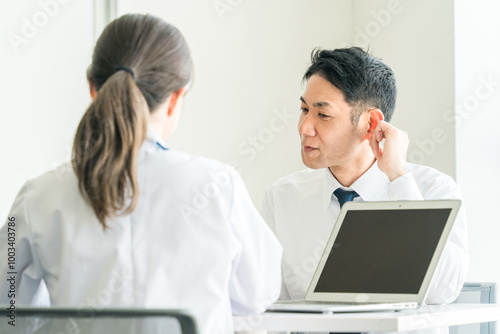 Obraz premium 耳の不調を医師に相談するビジネスマン(難聴・耳鳴り・中耳炎)
