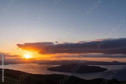 Obraz premium 屈斜路湖に登る朝日 美幌峠から