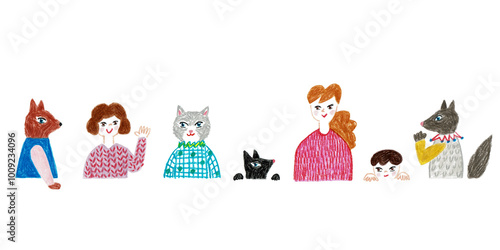 © K.M.S.P., Obraz premium 手描きイラスト テーブルに座る大人と子供