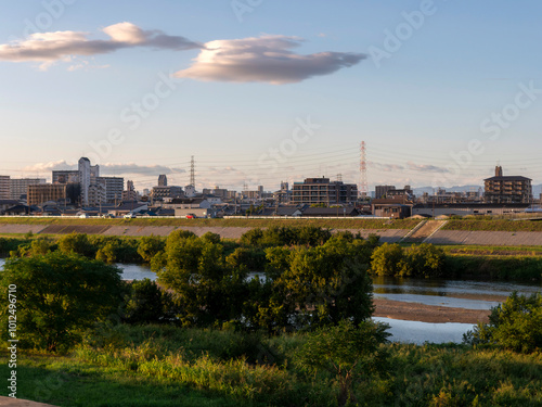 © しょこまろん, Obraz premium 大阪を流れる大和川と街の風景