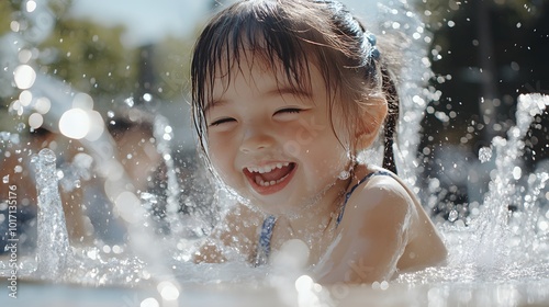 Fototapeta premium 公園の噴水で遊んでいる日本人の女の子