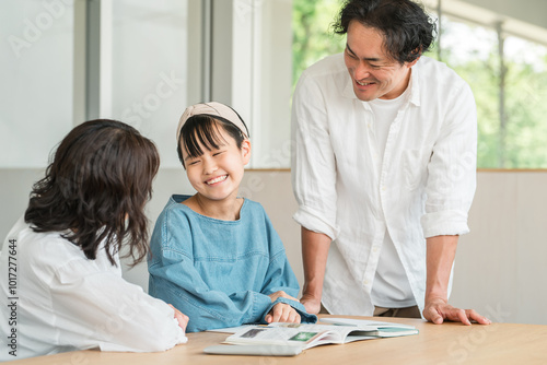 Fototapeta premium 娘の勉強を見ている母親と父親(ファミリー・宿題・受験・受験勉強)