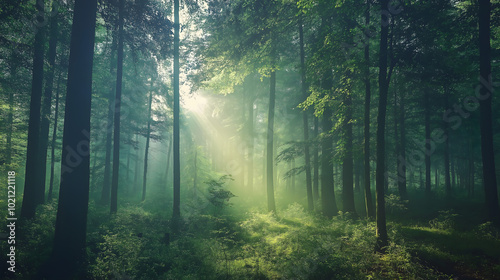 © Carry, Naklejka premium 清晨阳光透过绿色茂密的森林