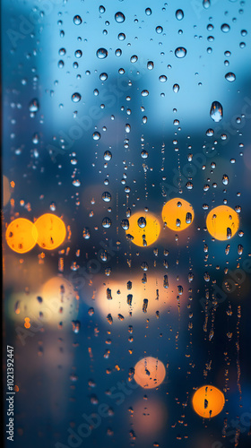 © Carry, Fototapeta premium 雨覆盖窗户的特写镜头,背景是路灯的模糊图像