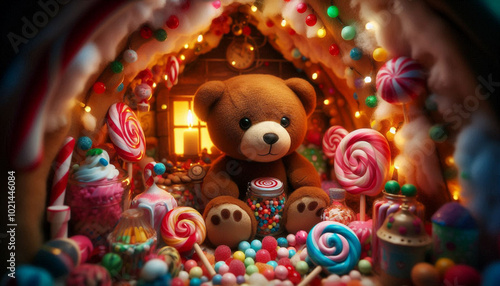 Obraz premium 甘い香りが漂うお菓子の家の中にクマのぬいぐるみ