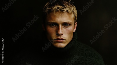 © chic designs, Fototapeta premium ダークグリーンのセーターを着た思慮深い若い男性 - デジタルメディアとデザインのためのファッション写真