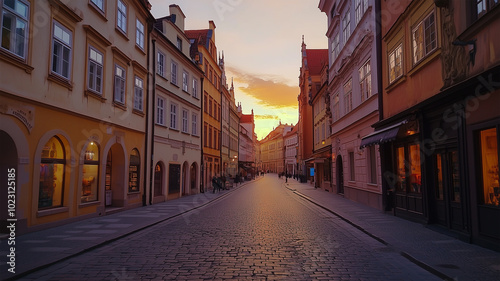 Obraz premium 夕暮れに染まる無人の石畳の街道